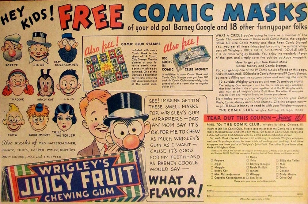 Kids could earn this full-color lithographed mask by mailing in Wrigley’s gum wrappers. Produced by Einson-Freeman Co., the masks were officially licensed by King Features Syndicate and mailed to members of “The Comic Club.” Each carried a copyright stamp and “PAT. APPLIED FOR” note on the back flap.