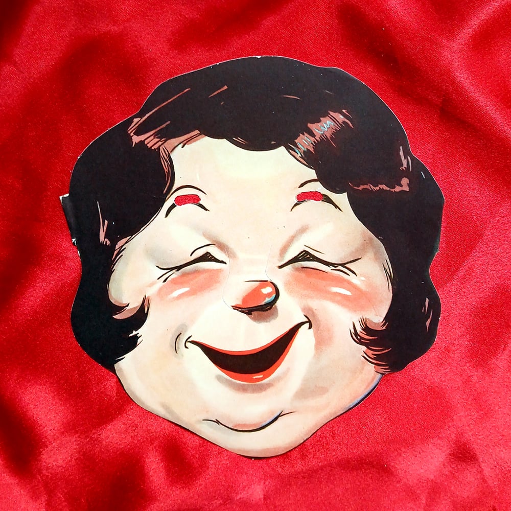 Measuring 8 by 8½ inches, the mask features Clarice’s beaming smile and tightly curled dark hair. The cheerful design was simple yet instantly identifiable to newspaper readers of the day, reflecting the comic’s exaggerated style.