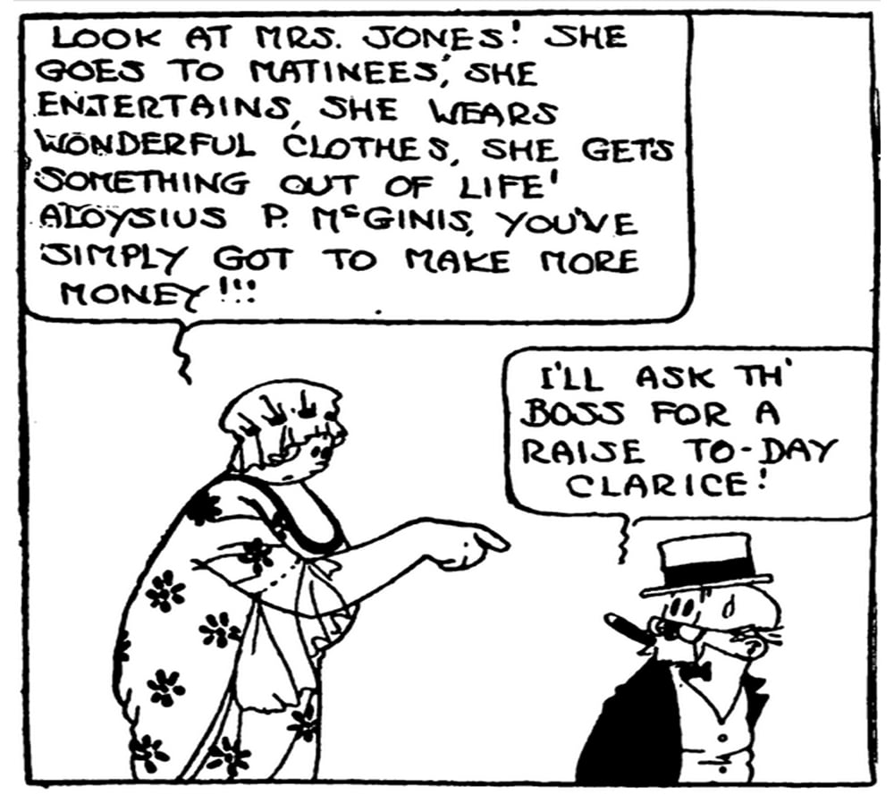 Clarice McGinis appeared in Keeping Up with the Joneses, a comic strip created by Pop Momand in 1913. The strip coined the phrase still in use today—“keeping up with the Joneses”—symbolizing social climbing, envy, and the pressure to match one’s neighbors in status and possessions. Clarice, the matron of the family, was instantly recognizable with her plump cheeks, cheerful grin, and hearty laugh—an embodiment of the satire behind the strip. The comic ran for over two decades, cementing its influence on American language and culture.