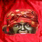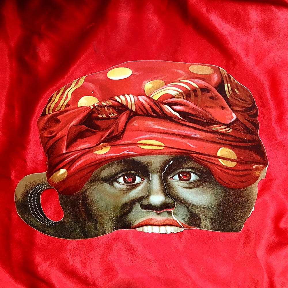 The mask depicts a so-called “Moorish Fortune Teller,” a bold and theatrical character type popular in Edwardian-era masquerade culture. The deep tones, polka-dotted turban, and intense expression were achieved through multi-stone chromolithography, giving the mask a richness and depth of color that still shines today. While rooted in the entertainment tropes of its time, it now also serves as a vivid artifact of how exoticism and racial caricature were used in early 20th-century advertising and costume design.