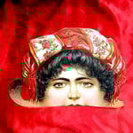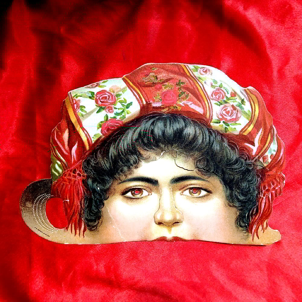 The Gypsy Lady is beautifully chromolithographed in bold colors with vivid red roses and patterned kerchief, framing expressive, lifelike eyes. The printing process produced deep tones and shading that still pop over a century later. This style reflected the fascination with exotic characters and theatrical imagery popular in Edwardian-era masquerade and vaudeville culture.