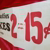 Straight out of the Great Depression era, this striking grocery store banner sign advertised a price war between two breakfast titans: Kellogg’s Corn Flakes and Post Toasties. Promoting “2 packages for 15¢” (or 2 for 17¢ at Country Club), this piece captures the competitive marketing that defined the cereal aisle of the 1930s.